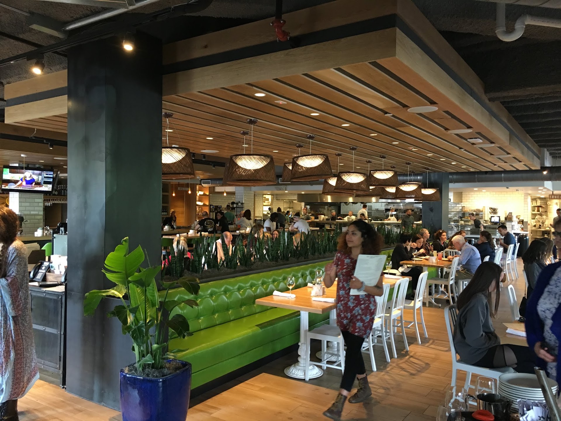 The second visit, before a concert at Starlight, we were seated quickly with a slow wait for someone to take our order or give us water. One waitress could sense us waiting & took care of us right away. I order again the Kale drink, it was tasty, ginger flavor. Not sure if they use organic fruits for this drink? I order the Grass-fed Burger topped with umami, mushroom, caramelized onion, organic arugula, parmesan, mayonnaise, flaxseed bun it is $17.50 They ask how youâd like your meat done. Iâll ask for medium well next time, a lil to pink in some places. She ordered the Grilled Chicken & Mozzarella Panini organic DiNapoli tomato sauce, broccolini, mozzarella, herbs, chili flake, crispy house-made pita. It is $15.50. She thoroughly enjoyed this sandwich. The crispy house-made pita is delightful! The waitress was attentive with our check out and we left in a timely manner for the show.