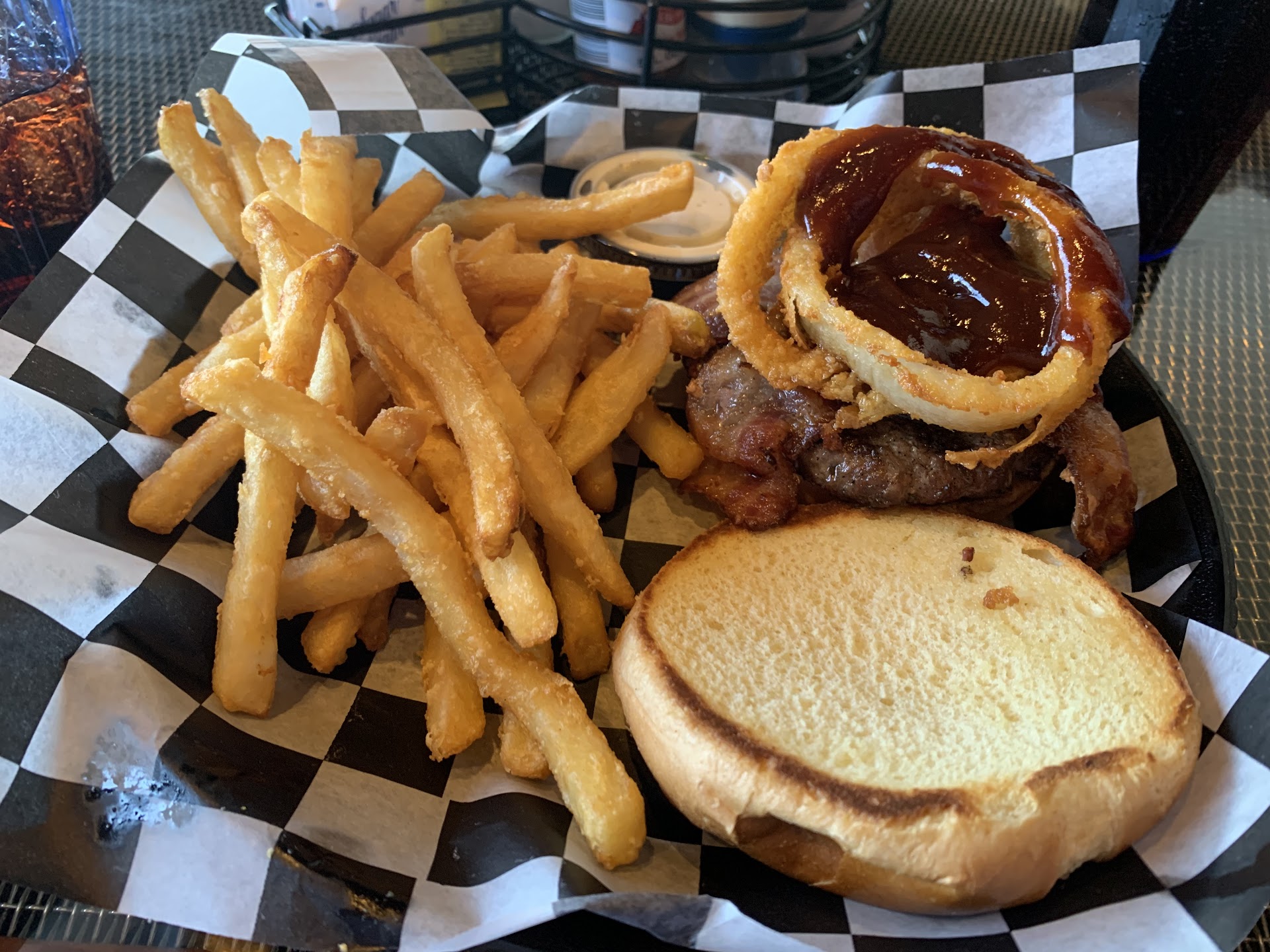 Read moreI was very happy with my experience here. I’m a NASCAR fan so naturally the location attracted me and it didn’t disappoint as it had a great view of the speedway and numerous screens throughout the restaurant showing games and the race. Taylor was my server and the service was fantastic, especially for a Saturday. Food came out in normal time and it didn’t disappoint. I got the BBQ Bacon burger and it...
