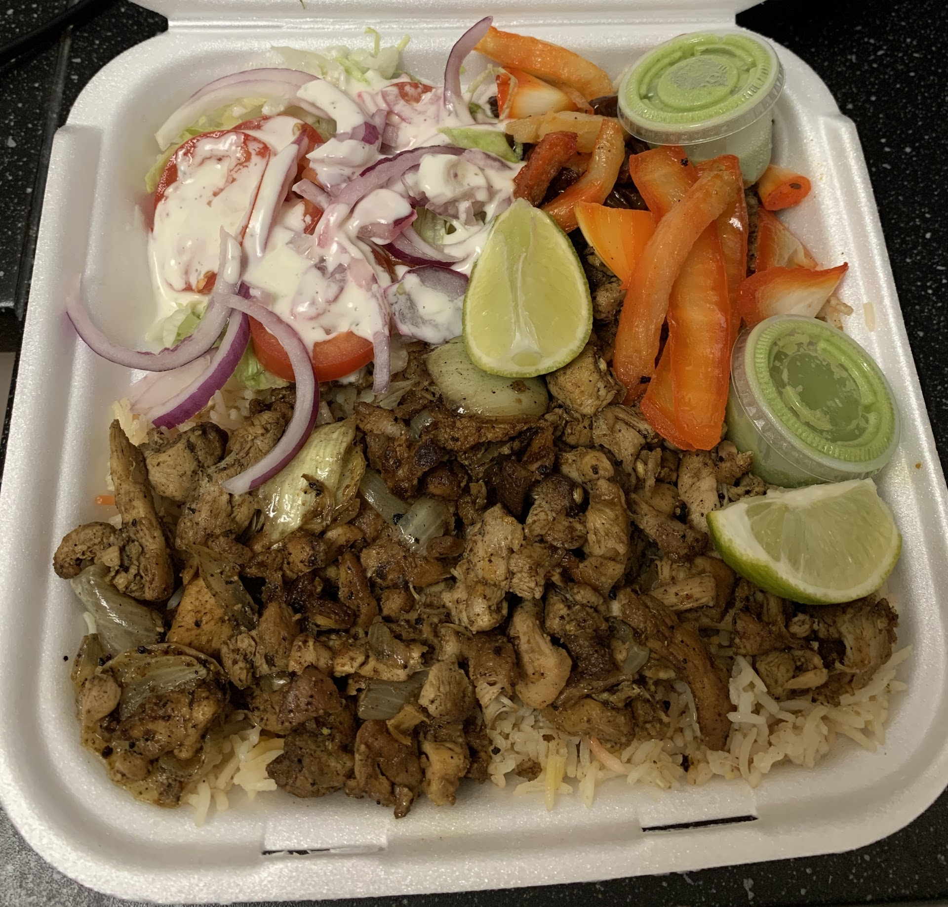 Read moreIt's kinda confusing at first given the area, but some customers helped out. A customer rang the bell at the order counter, then a guy came out from the kitchen, but he walked past me and started cleaning the tables, then he came to the kitchen talking to someone else while pointing at me, most conversations weren't in English. Then maybe the chef/owner came out from the kitchen, talked in English and cleared out my confusion. I got my food a few minutes after ordering, the chef/owner skipped my tips. Food was huge portion and delicious. The rice and chicken was a bit charred and very flavorful. The green sauce was very good, it's spicy but I only felt the spice at the back of my throat, with the lime to freshen up and balance out...