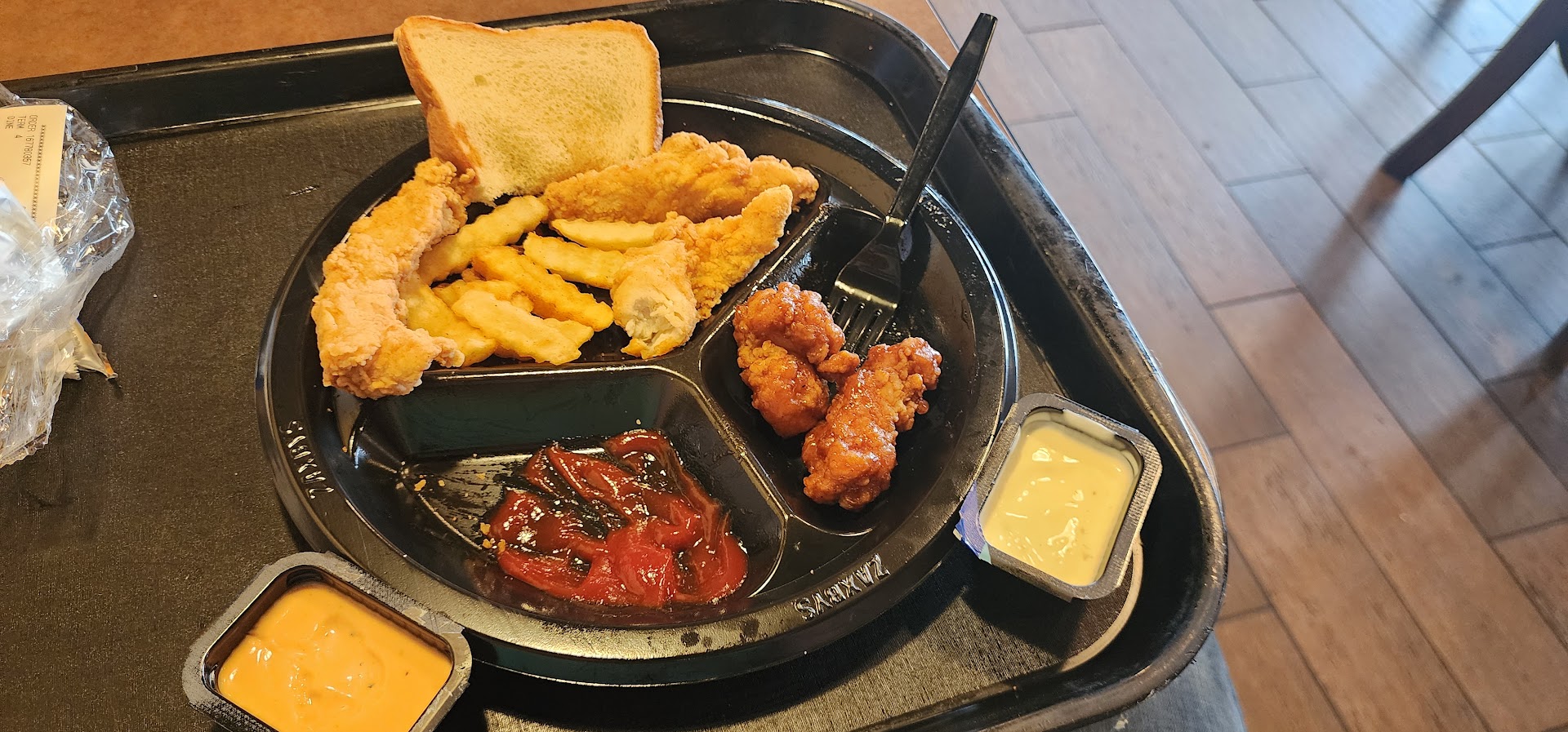 We have tried about 5 different times to eat here. At first when they just opened it was good. I have a big family and when we order all our meals we always pick our sauces. They make a big deal out of it. Today was the last time we will ever buy from zaxbys! Went through drive thru. They was rushing us through the order. After everything they kept saying is that all.... I told them what sauce we wanted. When we got to the window they had charged us for every single sauce. We ordered a 20 piece fingers and 4 meals.... And ended up only giving us 5 sauces. We had to go back in there and get the others that we was suppose to get with our food no extras. We pulled into the parking lot to check it all out. The 2 large fries was a single serving. Combined it would jave made 1 large. The chicken fingers was DRY and BURNT! Fries were mushing and most had way to much seasoning on it. Yhe toast was soggy and cold. Wings was luke warm and soggy like was setting in the sauce for a hour or 2. Staff was rude so was the manager that wasn't listening when he took the order... he was very rude when I questioned about the sauce. We will not be coming back to this place I spent $80 here and was the worst experience ever.. I can't wait for Rasing Canes to open up down the road to go...