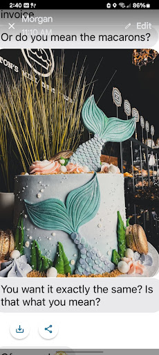 Read moređ¤ŹOMG!!!!!! I ordered a cake that had a picture of it on their website, and I asked for it to be exactly like that one. It was for my 55 year old mother inlaws birthday, who loves dark purple and blue colors and mermaids. It was a surprise party. I even have text messages from me to the owner, making sure how I wanted it. ( click on the pics, and you can read what she asked me in the text message and what i said) "I wanted it exactly like the picture online. Well....... when it was picked up, it was mostly HOT PINK WITH NO MERMAID TALE ON TOP LIKE THE PICTURE HAD!!??? It cost over $250, and all she said was she had the right to use an artistic license to change it up if she wanted. My mother inlaw, I could see disappointed and shocked that it was hot pink ( SHE HATES HOT PINK!!!!) and the mermaid theam did not really pop to mind. It just looked like a fish/under the sea cake. NOT really a mermaid them. But she was still grateful and said thank you to me.