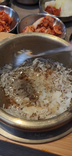 When you get the stew, crack open the egg right away. Swerve the rest around so the egg will cook in the stone pot. My husband tried the bulgogi stone pot bibimbap, loved it, and ate all of it both times. You can get plain water or barley tea which is also a korean choice of water that provides vitamin B6 among others, you can chose to have it hot or cold ㅡ it isn't extra. As you can see here, the bottom of the rice get stuck. You may chose to pour a little bit of barley tea in there and scrape them off like we did. Its even better for the bibimbaps :)