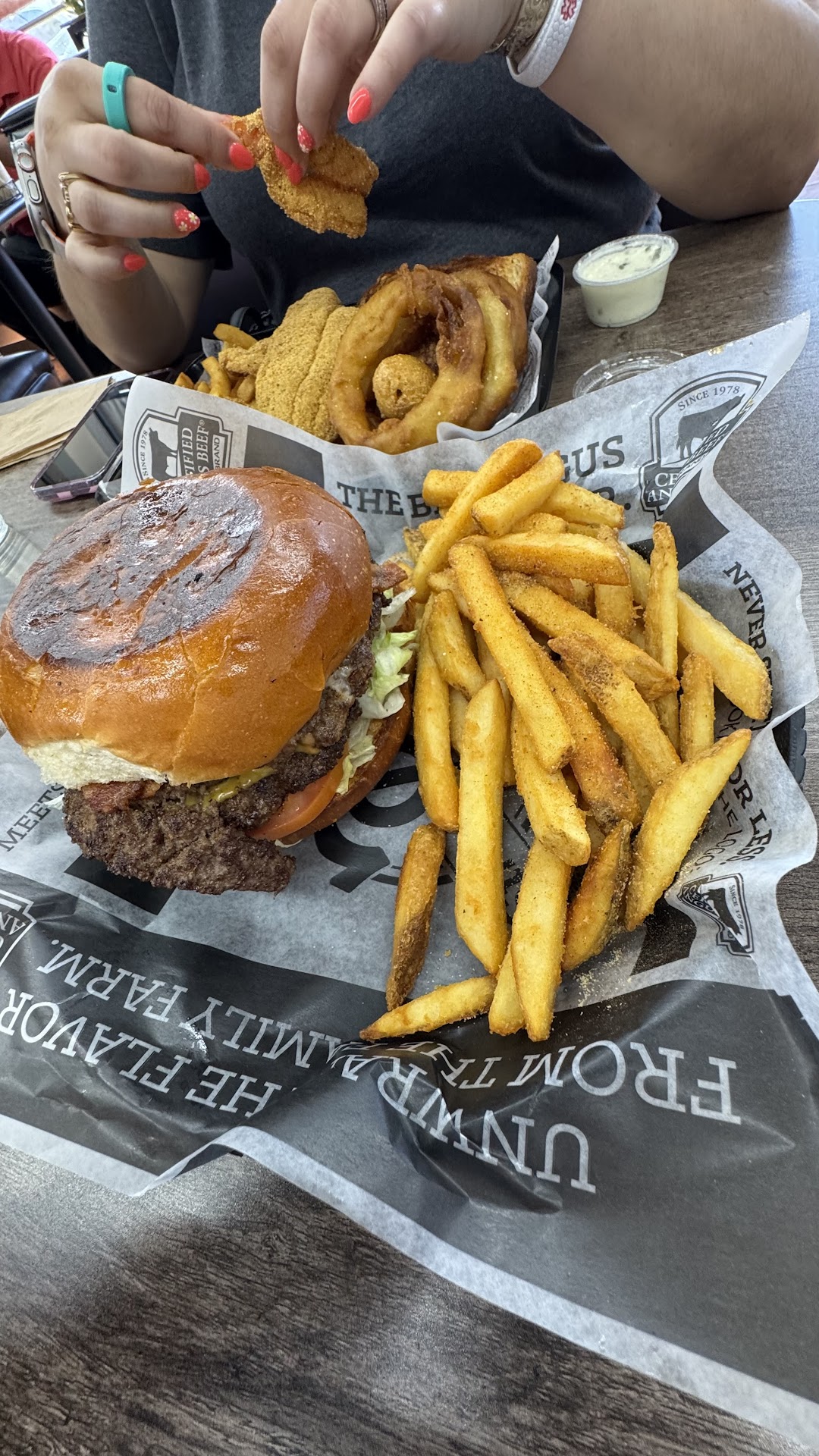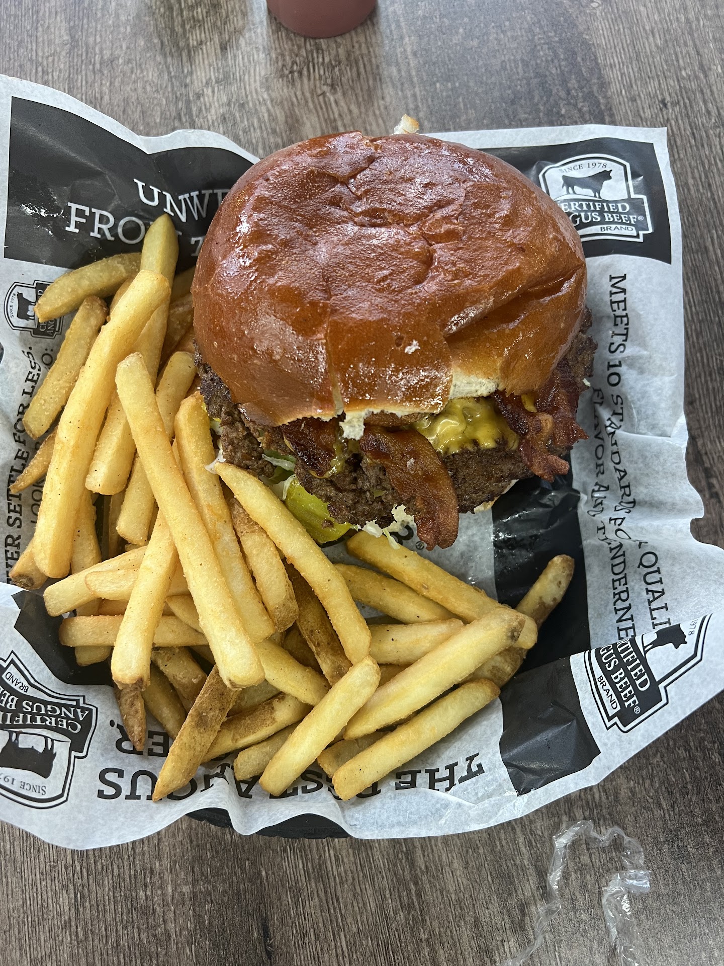 Read moreFirst things first, the burgers are absolutely massive. It will dominate the take out container. I cut mine in half so that it was actually manageable to pick up. For the price, I was very pleasantly surprised that it was such a huge, loaded burger. I believe I had the equivalent of a whole avocado on there, as well. The burger comes with fries, sweet potato fries, or onion rings. I regret not getting the onion rings because they looked delicious, but the fries were good, too. My wife was very pleased with the sweet potato fries. I chose the JLB special, which is a burger with a "spicy" chicken breast on it. I would term it "we'll seasoned", not spicy, but it may be the spiciness was muted by all the other flavors. It was delicious, but it felt like a bit much, and the proteins seemed to compete. This is by no means a complaint, but after giving that beast a try, I am curious to try "just a burger" or "just a chicken sandwich". By contrast, a friend has a Turkey Melt and it looked like simple, delicious perfection. Another member of the group had smothered steaks fries and this side dish should be considered an entree or a shareable. Bottom line: GENEROUS PORTIONS. We placed our order over the phone for pickup and that was a very pleasant experience. The employee was very patient, helpful, and seemed to be in a great mood. Pickup was the same, with the food neatly packaged and ready to go and the drinks safely secured in a cup holder. When you check this place out, bring an appetite, or someone to share with, but do check them out....