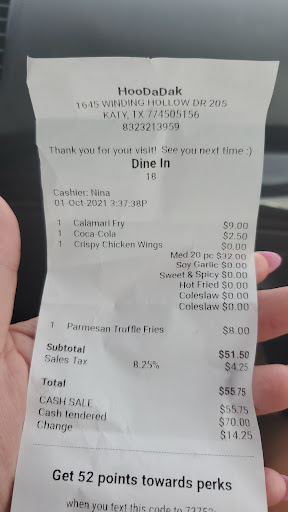 Here's the bottom line - the chicken is good. The coleslaw is terrible (obviously not there for that, but it came with the combo so...) Their ranch dressing is no more than an off brand Hidden Valley Ranch or something like that (which is fifty cents each...yuck!), the calamari is decent, the coke must be from a 2L that they pour in a pitcher with ice and refill your glass with (rather flat), the parmesan truffle fries are good & the service is sub par. We went during the afternoon. The nighttime might make for better ambiance because you don't notice how terrible the bench seats are (the huge upholstery rips made it uncomfortable to sit while wearing shorts - it's really bad.) The staff wear black and my husband made a comment that our server looked sloppy. There was the smell of Fabuloso (or some type of cleaner) in use (not what you want to smell while eating), & our table needed some sweeping underneath it before we sat down. I do not derive any pleasure from penning a negative review about an establishment because it means it was a bit of a waste of our money and time. Try HOTSOME CHICKEN instead off Long Point. The food is DELISH! It's clean, bright and the wings with their Korean Junkie sauce are SO YUMMY! Our bill for an order of Calamari, a coke 20piece combo & parmesan truffle fries came to: $55.75. We tipped $10 on top of that regardless, but MAN, there are WAY TOO MANY PLACES IN the Katy/ Houston surrounding area to waste your money here. Sorry, HooDaDak......