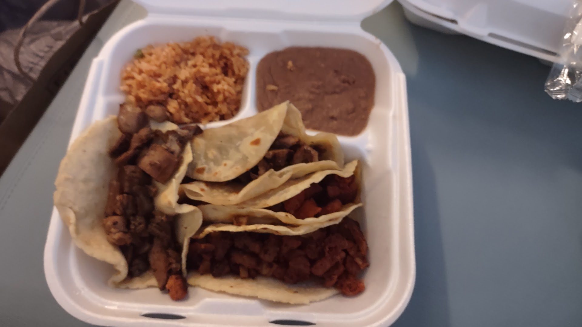 This is my 1st time to the place and I have to admit it's a bit old (and I've been to a few places yrs ago). I wasn't sure I made the right decision but I was here, hungry and starving. So I before I ordered I asked the waitress if the Horchata was made in house and she said yes. So I picked one up. When she got back in asked if the tortillas were made in house and she said yes. I've been to other places that use store bought cheap tortillas and it just messes up the tacos. So I picked up a bean, chorizo & egg, papa & egg and a machacado & egg. The Beans were not the usual pinto n they looked like canned but I remembered that these were the old original beans they had long ago. The taste was greater than expected for how they made them; literally made me forget the pintos. The Machacado was crisp in some areas and not dry throughout like most. This had tomatoes and onions cooked with it, it kinda threw me off and I thought it was wasted but it turned out good. The tomatoes gave a lil more moisture to it, not that it needed it surprisingly! The chorizo was great as well more chorizo flavor and I guess all chorizo has sugar added or something cus this had a lil sweetness to it as well. I'm use to not having that. But the good news is that unlike some others that are drowning in that red oil this had a few drops come out! And finial was the papa & egg. The papa's were huge chunks and the egg was great and not dry. All tacos were not loaded with grease like a few places, Eggs were light and had moisture to them.