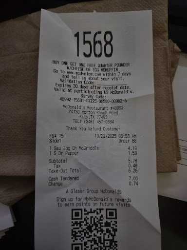 Read moreAfter I finished paying for my order through the drive through they made me wait 30 minutes to get a mchicken and a McDouble. It got to a point where I had to use my car horn twice to get someone to come over to the window and after waiting for 30 minutes the young lady who came to give me my order gave me an immediate attitude. I was honestly speechless at first because I’m like y’all are the ones making me wait 30 minutes over such a small order. When I ask the young lady if there was any good reason for for them making me wait so long she said she dint know that she just saw my food sitting on the counter and the people responsible for making sure that drive through orders get their food do that all the time. I left and decided to not continue the conversation and promised my self to never ever come back to this location. It’s north worth the trouble it’s already very unhealthy food and adding an unnecessary head each into the mix is not worth it guys. Stay away from this place and make the extra drive to the Macdonald down the road on grand parkway in front of Walmart.