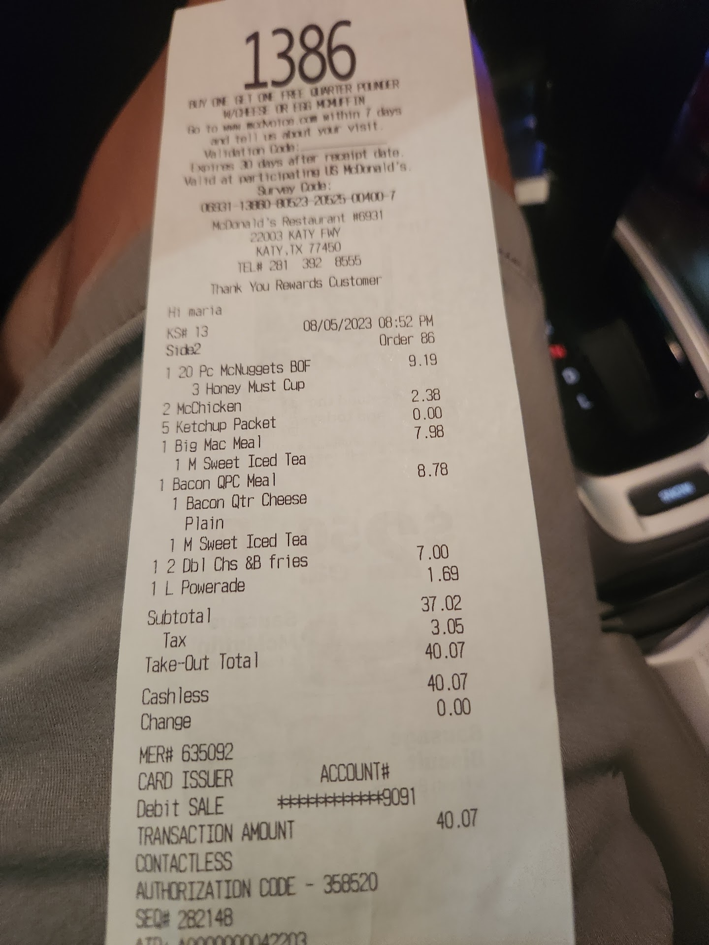 The issue came two days later when I checked my bank account and saw a $9.50 Mc Donald’s charge! There is no way I would have purchased a breakfast biscuit combo for $9.50 had that price popped up on the screen. I had of course thrown the bag & receipt away by then so I have no idea what they charged me for or if they added their own tip or what. Either way it’s dishonest and I will not patronize this establishment again. My advice is to double check the amount when you get to the window, pay cash, and always check your receipt! Otherwise you have no idea what they’re...