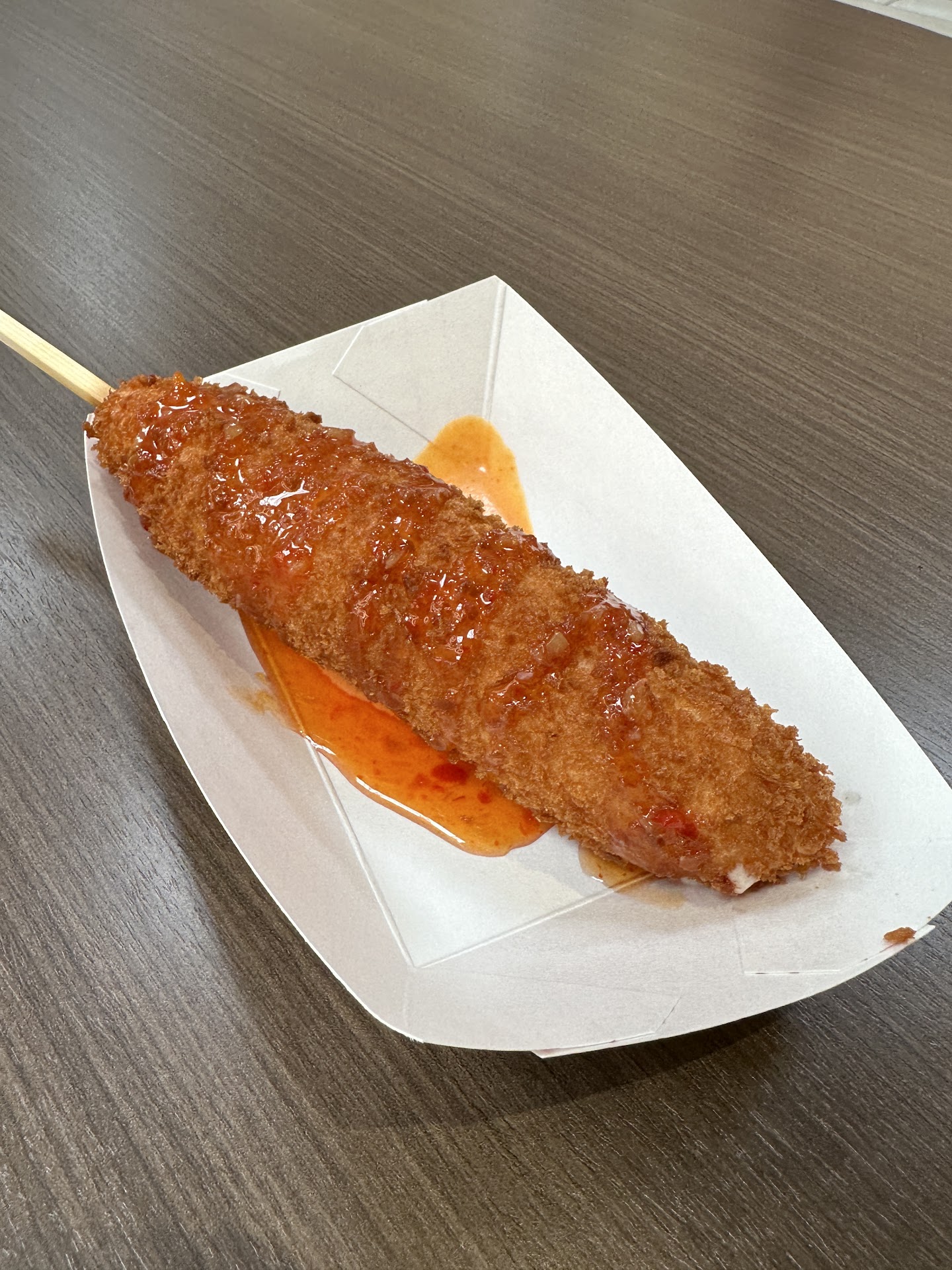 A novelty experience that I mostly regret. Split a half-half sweet potato / mozzarella dog with my kid. The cashier was helpful and kind. The cooks looked mad š”- with mean mugging. That should have been my first clue that there was no love ā¤ļø in the food. (Maybe theyāre underpaid and overworked?) Bland with a sweet out-of-place aftertaste even with the help of some sauces. Thick awkward texture with the corn dog part with semi-burnt sweet potato. It seems like the oil is rancid or the frying temp was off. The cheese pull was fun. The ābeefā hot dog was worse Iāve ever had - no snap, no flavoring, undercooked, just pale and cheap tasting. Yuck. But the Diet Coke was cold and fine. Okay, update: a couple hours later - both of our stomachs are aching and hurting just makes me question the food safety of the joint. Demoted to 1 star at your own peril and risk. I recommend for people have food tik-toks and want a guaranteed...