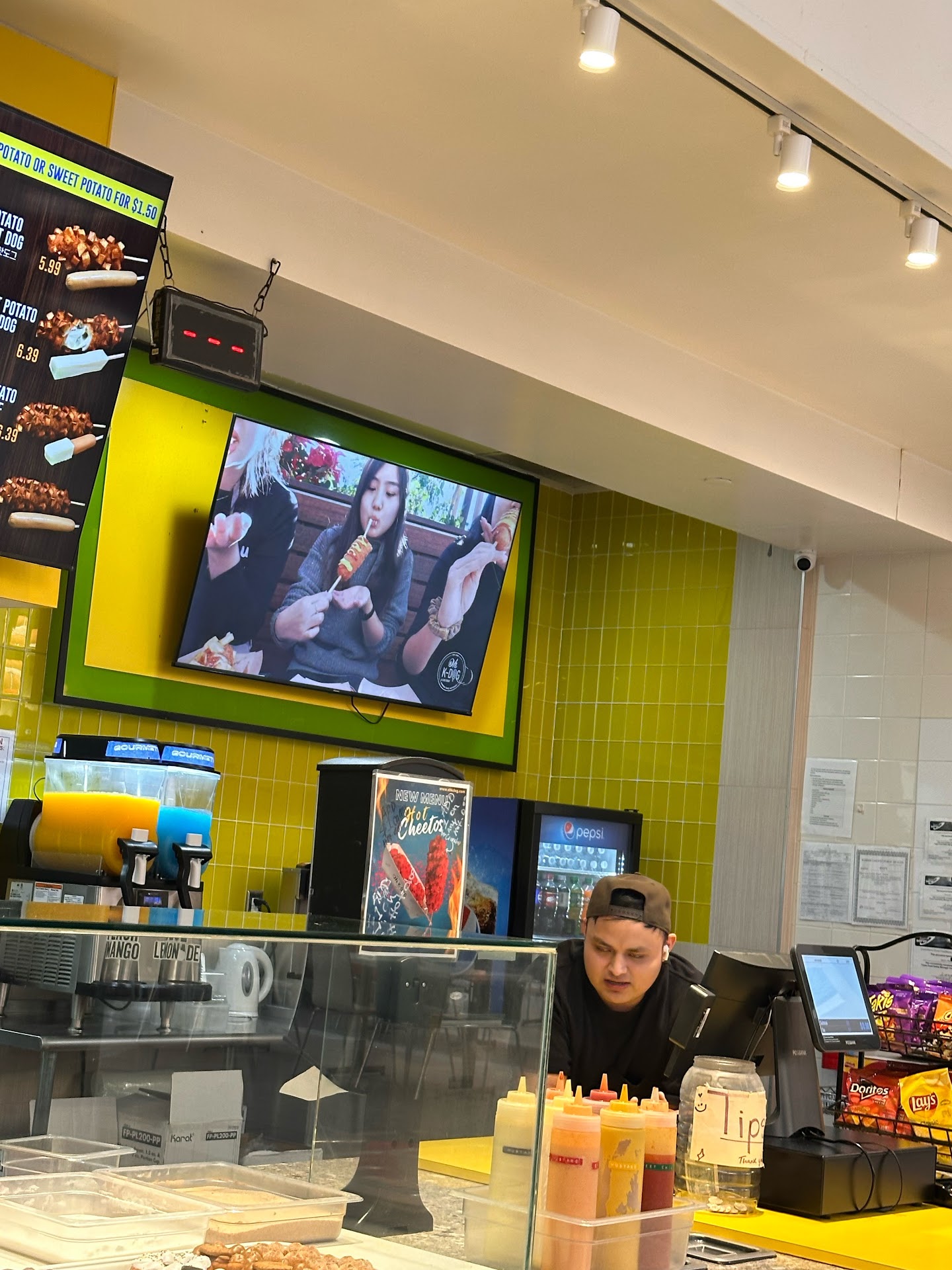 A novelty experience that I mostly regret. Split a half-half sweet potato / mozzarella dog with my kid. The cashier was helpful and kind. The cooks looked mad 😡- with mean mugging. That should have been my first clue that there was no love ❤️ in the food. (Maybe they’re underpaid and overworked?) Bland with a sweet out-of-place aftertaste even with the help of some sauces. Thick awkward texture with the corn dog part with semi-burnt sweet potato. It seems like the oil is rancid or the frying temp was off. The cheese pull was fun. The “beef” hot dog was worse I’ve ever had - no snap, no flavoring, undercooked, just pale and cheap tasting. Yuck. But the Diet Coke was cold and fine. Okay, update: a couple hours later - both of our stomachs are aching and hurting just makes me question the food safety of the joint. Demoted to 1 star at your own peril and risk. I recommend for people have food tik-toks and want a guaranteed...