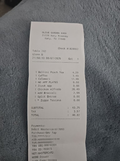 Read moreTHIS IS BY FAR !!!! THE WORST EXPERIENCE I EVER HAVE AT OLIVE GARDEN. BAD FOOD QUALITY, INEXPERIENCED SERVER NO CUSTOMER SERVICE SKILLS AND TO TOP IT OFF THE MOST UNPROFESSIONAL, RUDE AND CARELESS MANAGER ( Kian d. M.) Let me start with my appetizer I ordered a fry calamari!!! OMG cheese worst and most disgusting I ever have, super overcooked, burn rubbery dry and I can tell they have a change the OIL in weeks, now when it comes to the server I have to remind him for soups refills, drinks refills and when finally he ask how was everything after 15 or 20 minutes we got our meal I told him about the appetizer how bad it was an share the details, this is exactly what he said, thanks for letting me know i will tell the cooks, after that never came back not even to check if anything else was needed, nor come or desert etc. Etc. Also I noticed they don't have a team service the other staff don't care about other servers tables, it is super bad level of customer service in this establishment and I understand why because star from the top ( management) it is sad and dessapointed the lack of service and food quality, so we just decided to get up and leave since the server never came back and I know he didn't deserve the 15% tip I was still generous to leave but I don't think is his fault when the manager never came and checked on any tables and let's not even tock about her appearance!!!☹️ ppl don't dress properly as manager now i remember before you can tell who was the manager because they always dres properly and professional, this is not the case anymore and as I was leaving i sew her sitting down in the waiting area bench for customer and complaining and Wayning about it believe work or shift or maybe everything in general 🤦♂️🤦♂️🤦♂️ so as I was leaving i didn't know she was the manager of tough she was a host, so I proceed to share my awful experience with her and told her how sad and dessapoint I was because I told her I have work in the food and restaurant industry for a very very long time and this is what she said ohhhh I wish I would to know dud!!!!! and I say I you would be doing your Job as a manager and check on tables just like your survey sak to do right after you pay you would know!!!!! Hellooooo🤦♂️🤦♂️ And after that she said whatever dud and this is why a comment at the beginning of my review starts from the top. So this is my ratings for this OLIVE GARDEN Location on 21220 Katy Freeway 👎👎👎👎👎 i miss the old good days of...