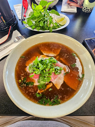 Seriously, do NOT miss the chance to eat here!! I've heard a lot about the history of Pho Binh, so my Husband and I were very excited to finally be passing through the area to visit this newest location! It only took one visit to know that we'd be stopping by every chance we get! The dining area is very cute and the murals on the wall give it a light, cheery, and comfy vibe! My husband loves Pho and tries it almost everywhere that serves it, while I usually try various menu items. However, this time we both decided to get a dish on the menu called Binh's Favorite. We were told that the beef bone broth marinates for about 22hrs..and it was highly recommended. It sounded delicious! When it was served, the portion size was great and the presentation was so lovely..topped and served with fresh ingredients! My husband had prepared to add lemon or lime to his broth as he usually does..however, it soon became clear it wasn't needed! Let me tell you..this broth is flipping Heaven in a bowl! My husband, the seasoned Pho eater, said that it was the best he's tasted and he wouldn't dare add anything to it because it's perfect the way it is! I also absolutely loved it! The broth alone is absolutely worth the drive! (No matter where you're coming from!) Plus, everything in the dish is cooked beautifully! The meats in the broth (Steak, Brisket, Meatball, & Tendon) were tender and so very good! The Rice Noodles were cooked perfectly as well! Everything was so delicious! The Service is also wonderful! Everyone was attentive and very polite! This is a family owned restaurant, and it's great to see the family working together! It's also easy to see that the owner, Binh, takes pride in his business and makes sure his customers are well cared for! We still had a long trip ahead so we also ordered a Boba to go! There's so many delicious flavors to choose from so I plan to try a different one each trip! Honestly, neither one of us can wait until we get to stop by and taste that Ah-Mazing broth again! I know there's more on the menu, and I'm sure it's all delicious, but.. That Pho Binh running through my mind all day! I'm a Pho Binh beef broth Girl Pho Life now! (Sorry, the Pho puns are way too tempting! Which reminds me, they also have a really cute selection of Hats...