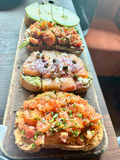 Smoked Salmon & Pesto bruschetta: The delicate slices of smoked salmon, adorned with a dollop of vibrant pesto, danced atop perfectly toasted bread, creating a harmony of flavors that was both elegant and satisfying. The richness of the salmon was balanced beautifully by the herbal notes of the pesto, resulting in a dish that was as visually stunning as it was delicious. Chef's special: Homemade Hummus topped with fresh Tomatoes. This bruschetta was a celebration of simplicity done right. The velvety smoothness of the homemade Hummus provided the perfect canvas for the bright, juicy tomatoes, which burst with flavor in every bite. A sprinkle of fresh herbs added a pop of color and freshness, elevating this seemingly humble dish to new heights. MAIN ENTREES The Raspberry Chicken Salad presents a delightful fusion of flavors and textures, elevating the classic chicken salad to new heights. Succulent pieces of chicken mingle with a medley of ingredients, including crunchy almonds and pecans, crisp apples, and the distinct tang of gorgonzola cheese, all nestled atop a bed of fresh mixed greens. However, what truly sets this salad apart is the exquisite raspberry vinaigrette that drapes each ingredient in a symphony of sweet and tangy notes. Its vibrant hue hints at the burst of fruity flavor it imparts, perfectly complementing the savory elements of the dish. With each forkful, the palate is treated to a harmonious dance of savory and sweet, making the Raspberry Chicken Salad a tantalizing and refreshing choice for any occasion. Prepare to have your taste buds transported to a realm of pure culinary ecstasy with the OMG Grilled Cheese. This extraordinary creation takes the beloved classic to unprecedented heights, boasting layers of decadent gruyere, velvety whipped brie, tangy goat cheese, and sharp white cheddar. But the indulgence doesn't stop there. Nestled between the layers of cheese lies crisp, smoky bacon, adding a savory depth that tantalizes the senses. As if that weren't enough, this grilled cheese masterpiece is served alongside a creamy tomato soup dip, offering the perfect accompaniment to the gooey,...