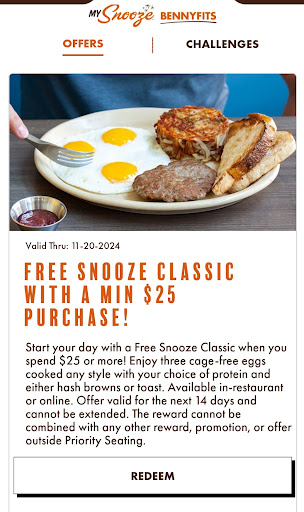 To place a nice big cherry on top of the whole experience, management needs to review the rewards section on the Snooze app. Specifically, "Free Snooze Classic With A Min $25 Purchase!" Details: "Start your day with a free snooze classic when you spend $25 or more. Enjoy three cage-free eggs cooked any style with your choice of protein and either hash browns or toast. Available in-restaurant or online. Offer valid for the next 14 days and cannot be extended. The reward cannot be combined with any other reward, promotion, or offer outside Priority Seating." After placing our order I asked our waitress in regards to the reward, I was told that we had to purchase one Snooze Classic in addition to spending $25 in order to qualify. Okay in my mind that's buy one get one free with an additional $25 purchase. That is NOT what the reward's details say. We spent over $60 but somehow don't qualify??? Where in the details does it say this? I tried applying the reward to an online check out order to confirm what the waitress was saying and she was correct. Reward cannot be applied at checkout even when following the details listed for the reward. If this is the case the details need to be modified otherwise it reads like false advertisement. The meal wasn't even for us but for one of our neighbors going through cancer. All I can...