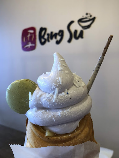 â˘Strawberry and mango Bing Su: 5 out of 5. my kids love this, and so do I. Any dessert with mango and strawberry is almost always a winner. The Bing Su ice is quite unique, and it is different than the ribbon ice at some of the Taiwanese or Chinese dessert places. The texture is like finally shaven frozen sweet milk, but the texture resembles fluffy powder snow like you ski on. Quite a delightful experience as it melts in your mouth. Itâs so good I even like eating it by itself once the fruit is gone, and even better if you still have some condensed milk remaining. Definitely big enough to share with 2 to 3 people. â˘I ordered Taro ice cream with custard filling (Nutella is the other option for filling) in the Taiyaki and paid extra $0.50 for the macaroon (I ordered pistachio)âoverall 3 out of 5. I think the Pocky stick they stuck in it might have been cookies and cream flavored (you don't get to choose)? I ordered coconut flakes as my free topping. The ice cream was pretty good: smooth and soft and good flavor--4 out of 5. The macaroon was not very good because the outer cookie part was not crispy at all, so 2 out of 5 for the macaroon. I thought that was quite a bargain to get a macaroon for $.50, but in the end thatâs not worth the extra calories for a subpar macaroon. The custard filling was OK, but because they put it inside of the taiyaki, you canât even get to it until youâve already eaten all the ice cream, but then all youâre eating is a custard filled taiyaki pastry. It would be better if you could eat it all together.Itâs also very messy to eat. That ice cream starts to melt and dribble down the sides. The taiyaki (fish shaped pastry) is somewhat soft, similar to a waffle, crispier on the outside, soft on the inside. The guy who took my order described it as âcrispy,â but itâs not crispy nor firm enough to serve as a cone for ice cream. This makes it somewhat squishy, which adds to the mess. I had to wash my hands with soap and water afterwards. I probably will not plan to order this anytime soon, unless Iâm in a really good mood to give it another try. â˘Seating: I like the big counter height table near the front entrance when I come with a big group. Kind of nice that they have a power strip towards the middle of the seating against the wall, but I guess thatâs only helpful if youâre seated directly in front of it. Would be better if they had spaced out...