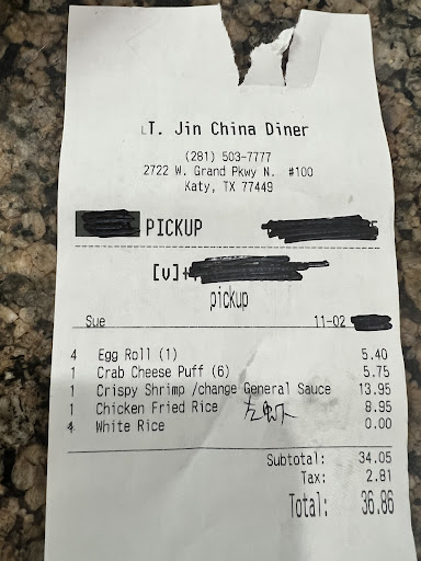 Read moreT Jins delivered an outstanding dining experience! We ordered the Mushroom Chicken, Beef Lo Mein, Beef Fried Rice, Sweet and Sour Chicken, and the Chicken Vegetable Egg Rollsâand every single dish was a hit. The egg rolls were perfectly crispy and packed with flavor, and the Sweet and Sour Chicken had that classic tangy punch with a satisfying crunch.