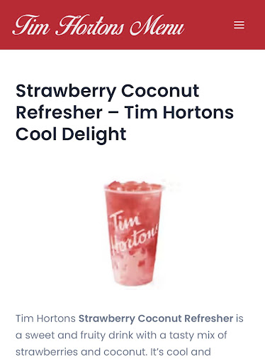 Read moreI’ve been coming to this Tim Hortons location regularly for the past two weeks, and I’ve always appreciated the friendly service especially from the short lady with the glasses who is consistently kind and welcoming in the morning shift .However, today I had a disappointing experience. The employee working the front, wearing a hijab, was very rushed with my order even though there were no customers in line and no one in the drive thru. I ordered a hash brown and a sausage biscuit, but before I could finish my order, she had already printed the receipt. I then asked for a MEDIUM strawberry coconut refresher something I’ve ordered many times at this location and is both on the website and advertised in store. When I received my order, I was only given the sausage biscuit (no hash brown), and the drink I received was not what I asked for. I told here there was no hasbrown in the bag, she told me I didn’t order a hash brown and that they don’t sell the strawberry coconut drink, which is confusing since I’ve had it from this very location multiple times. She walked away while I was talking and came back saying she had to charge me extra . I normally don’t leave negative feedback, but being told I ordered something I didn’t, and then trying to charge again for something I clearly asked for , felt extremely unfair :/ when she brought the correct drink size large and it had clumps (again it has neverrrrr happened before) ( The pictures below show that they do in fact sell strawberry coconut refreshers ) AND the same drink I’ve ordered plenty of other times at this exact same location one without clumps and the one I received today from her...