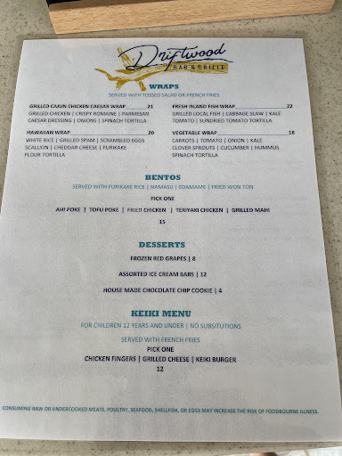 I only tried the fries, but they were good. The staff at the grill/pool area were super friendly. My only big disappointment was paying for two upgraded margaritas and two virgin lava flows that turned out to be about $111. I feel that the bartender on staff for that day totally upcharged us, Each margarita was $35 plus 18% gratuity already included, Served in an 8 ounce plastic cup by no means worth $35!!! To put it in perspective. We had a whole 4 meals 4 drinks and 2 added salad bars, That included lava flow and alcoholic drink, lobster tail, macadamia crust fish, ribs&chicken, chicken tenders meal and calamari appetizer etc. for $230 at Dukes. The comparison was nothing compared to $110 tab for four drinks at the driftwood bar and grill!!! I wish I had kept both receipts to show the atrocity of the...