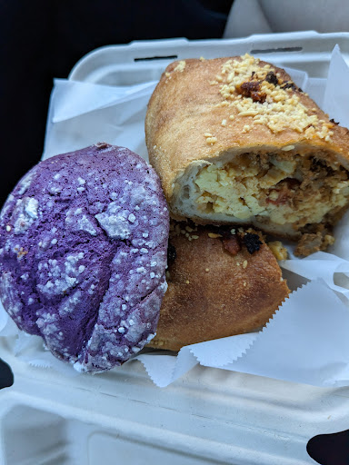 I had been to the Kilauea bakery a few years ago and bought one of their nice mugs ā itās still my fave mug at home : ) Going back there this year (the bakery is now 25 years old) I was a little bit disappointed but still think itās worth a visit if youāre in the area. The space around the bakery is welcoming and good for either social gatherings or some solo work or reading ā lots of tables in a pretty garden setting; free WiFi and a small library of books for kids. I found their house coffee to be just ok ā not as good as some of the good coffee spots on the island, but drinkable enough. A slice of pizza ($4) was filling and tasty without being memorable ā the thicker semolina crust may not be to some peoples liking but I thought it was fine for a change from crispy thin crusts. Their coconut cream Ć©clair was amazingly heavy because of dense coconut cream filling and yet the chilled filling makes it a refreshing option for a hot day. The staff is pretty busy and donāt have a lot of time to answer questions ā so itās kind of a brusque, efficient vibe. They cater to vegetarians and those on gluten-free diets.