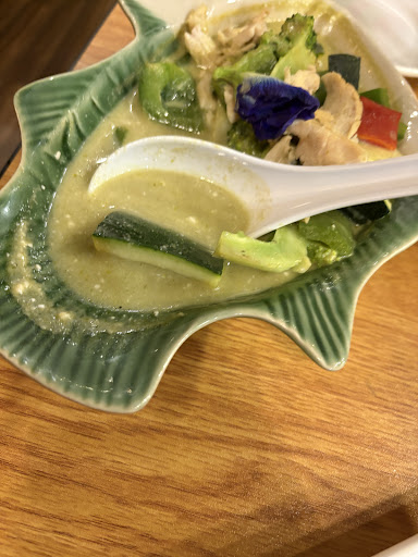 The green curry tasted like just thawed from a microwave. The broth was over diluted with congealed oil floating around. The thinly sliced chicken was overcooked and very tough to chew.