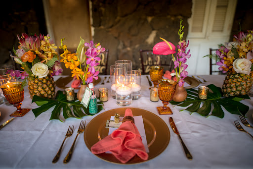 Plantation Gardens is not only beautiful, but the food is fantastic. We compared menus and prices between several reception venues, and by far, Plantation Gardens was the best value in terms of offering a high-quality event for a very reasonable price. The venue itself is very intimate and private, a former plantation house surrounded by an orchid garden on one side and a manicured lawn dotted with flowers and overhead twinkling lights leading to tall trees on the other. One guest said to us he felt like he was standing in a garden in Beverly Hills. We had cocktails and pupus on the lawn followed by a plated dinner on the open lanai. The waitstaff was very attentive to all of our guests throughout the evening. The food was great - steaks cooked to perfection, fresh-caught local seafood, and a delicious passionfruit vanilla buttercream cake.