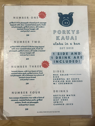 Read moreOur experience at Porky's in Koloa was nothing short of exceptional, starting with the warm welcome from the owner, Justin Hier. Having met him during our visit to Kauai, we were drawn to his restaurant to experience firsthand the charm and passion he exuded. Our expectations were surpassed when we indulged in the Number Three sandwich, which turned out to be an absolute culinary masterpiece. This delectable creation featured a perfect blend of havarti and provolone cheeses, succulent kalua pork complemented by grilled onions, and the refreshing addition of fresh pineapple, all nestled between slices of toasted cheese bread. The crowning glory was the sweet sauce that tied everything together. Without a doubt, it stands as the most delicious sandwich my husband and I have ever had. Seriously ever.