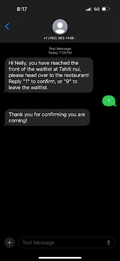 Our party walked around the shops close by and received a text at 7:20pm that we were next to be seated and to head that way and reply 1. We replied 1 to the text immediately, got a confirmation and arrived at the restaurant within 2 minutes.
