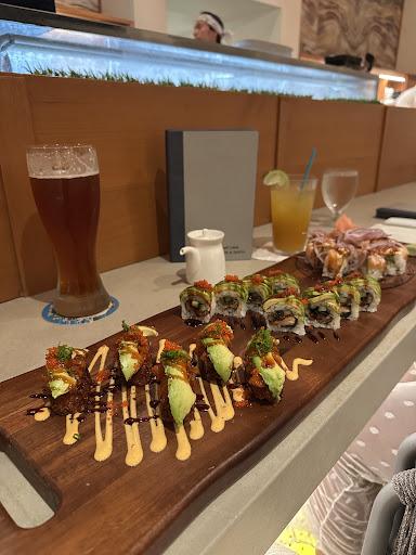 Food: Presentation 10/10 Rolls came on a surf board and placed oh so perfectly. Taste 10/10 very fresh seafood made with love, care and a delicate touch. It was art on a plate and tastes just as divine.