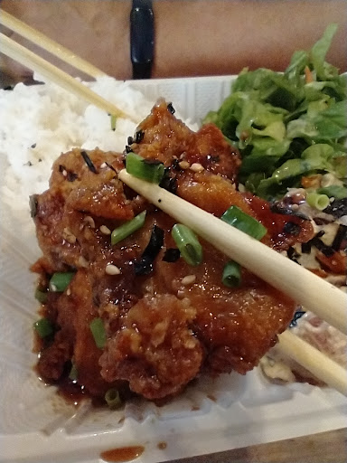 The chicken was real chunks of great dark meat chicken with the skin still on, and it was well marinated, deep fried super crisp, and sauced with a spicy, tasty, not hot, sweet sauce that really satisfied. The sesame seed and green onions were great accents. The poke had huge chunks of fish, and there were two sauces, one creamy the other soy sweet, and there were the good poke elements of plenty of onion and other goodies. It's funny to talk about the rice, as everyone has rice, but this was fluffy, soaked up everything it touched rice, which was the perfect compliment to everything else.