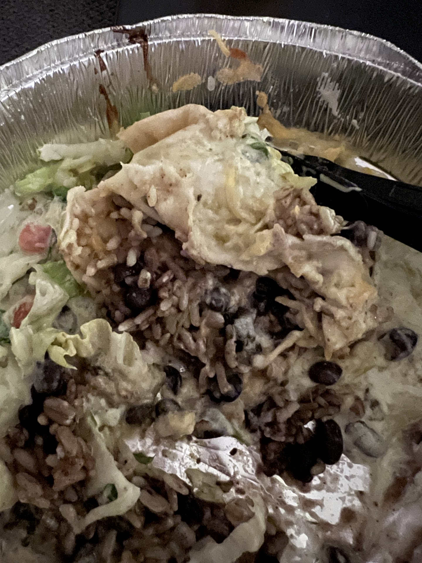 We started eating our food, and immediately something was off. Every bite was full of crunchy little pieces that were not supposed to be crunchy. Turns out the rice was completely undercooked! I tried some of my wife's food and found the same thing. Looking closer I also noticed the lettuce was wilted.