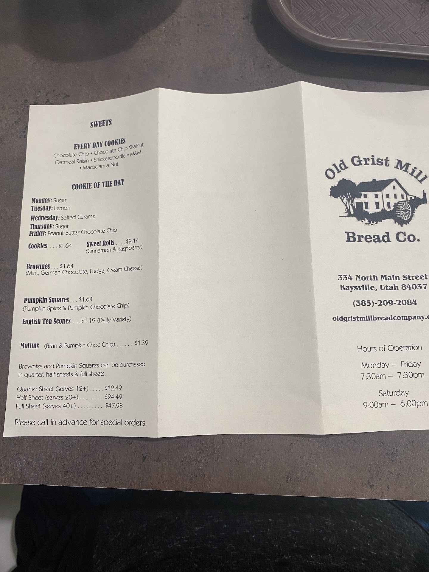 Read moreIt's always lovely to take a meal in Old Grist Mill in Kaysville. The owner is always super sweet and cares a lot about both his customers (and getting things perfect for them), and his employees (and making sure they're well taken care of). They follow mask guidelines and have reduced seating that keep people well apart. I love their soup, sandwich, and drink combo but I just love everything there in general! I did note that depending on the person who makes the sandwich they can be a little oversauced to some, but I appreciate it as I hate dry sandwiches. And I'm sure they would follow any requests to make your food more to your liking! The bread is always delicious, springy, and soft, and tastes like a gentle and warm homemade morning. It's both refreshing and nostalgic. The regular cinnamon rolls aren't my favorite, but their brownies are excellent and overall they do a great job at all of their food. They also sell tea cloths and other homemade useful, but not sure you needed it, items, as well as local jams and honeys, Lisa's Passion for Popcorn, and Stephens hot cocoa. I love this place and it always has a welcoming atmosphere with friendly employees who will attend to you with grace! One of my favorite, coziest places in Kaysville.
