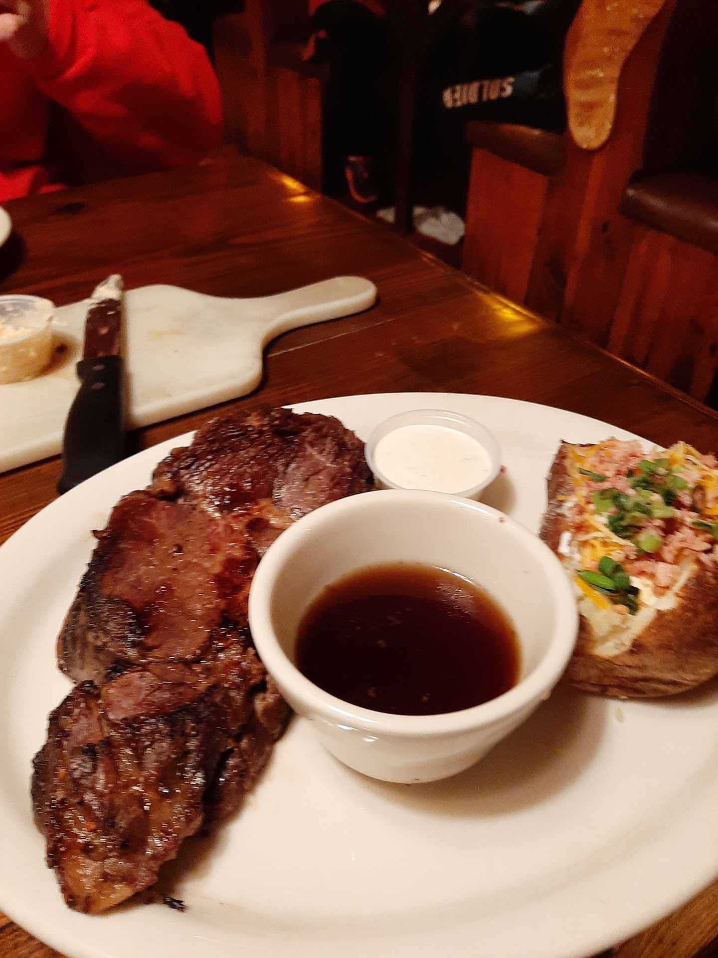 Read moreI love my flat iron steak and have been going to Whiskey Creek for years like since I was ity bitty. Went during lunch both my little sister and I got steak for our meal. Received my salad but got no bread. I waited further until we got our steaks and still no bread so I had to ask =(. When I ordered my steak the waitress tried to upsell me like they do, with a loaded baked potato. I told her just EXTRA butter and EXTRA sour cream. When I received my plate the potato was loaded. =( so after waiting a very long while (only 2 bites of my steak left) she finally came back over. I told her I could be wrong but this appears loaded. Her fake gasp of shock gave her away as to her knowing. She had me put the baked potato on the dirty salad plate and brought me a new one at which time I was done with my steak. I also had to ask for more water =( We were all finished for the most part my 5 year old sister was still munching when she gave us our bill. I was waiting on my sister, when the waitress came up and asked me if I was ready with my bill! I was like what?!! I wasn't going to say anything at all to the manger about having to ask for everything that is your job to do, but when she asked if I was ready to settle up I was appalled. When I'm ready it will be at the end of the table, don't try and hurry us out. At which point I asked for a manager, he came over immediately over doing the genuine vibe, when I told him what had occurred he did give a discount trying to make it right but his fake concern or genuineness voided...