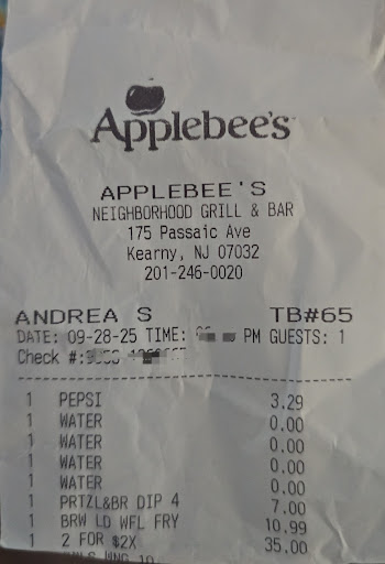 Read moreDecided to take the family to Applebee's for a treat it's been a longtime Decided to try this one in Kearny. Special drinks were tasty like the strawberry colada but the ginger ail soda tasted water down too much switched to water with lemon.food was a little pricey compared to the past when I last visited years back (I guess sign of the times) though the food was very good .mostly ordered the specials 2 for $32 but come in smaller portions .recommend the southwest Fiesta bowl had a nice kick if you like spicy rice and fresh salad. I forgot to take pictures of our appetizers but they very good aswell . Restaurant staff were very friendly and attentive to our needs .lively atmosphere with many TV screens...huge selection of drinks...only minus was the soda drinks were too watered down maybe next time will try with no ice to see if it makes a difference...we were still charged the drinks though we complained and didn't even drink them ....when we checked the bill they were charged they said they would remove them there mistake but the girl that was tending us was also tending the bar and forgot to remove them but it's OK moving on....we still left her a $15 dollar tip for having a good memory when taking our orders (no pad needed)and being attentive as server and bartender they must have been short staffed. The bill came out...