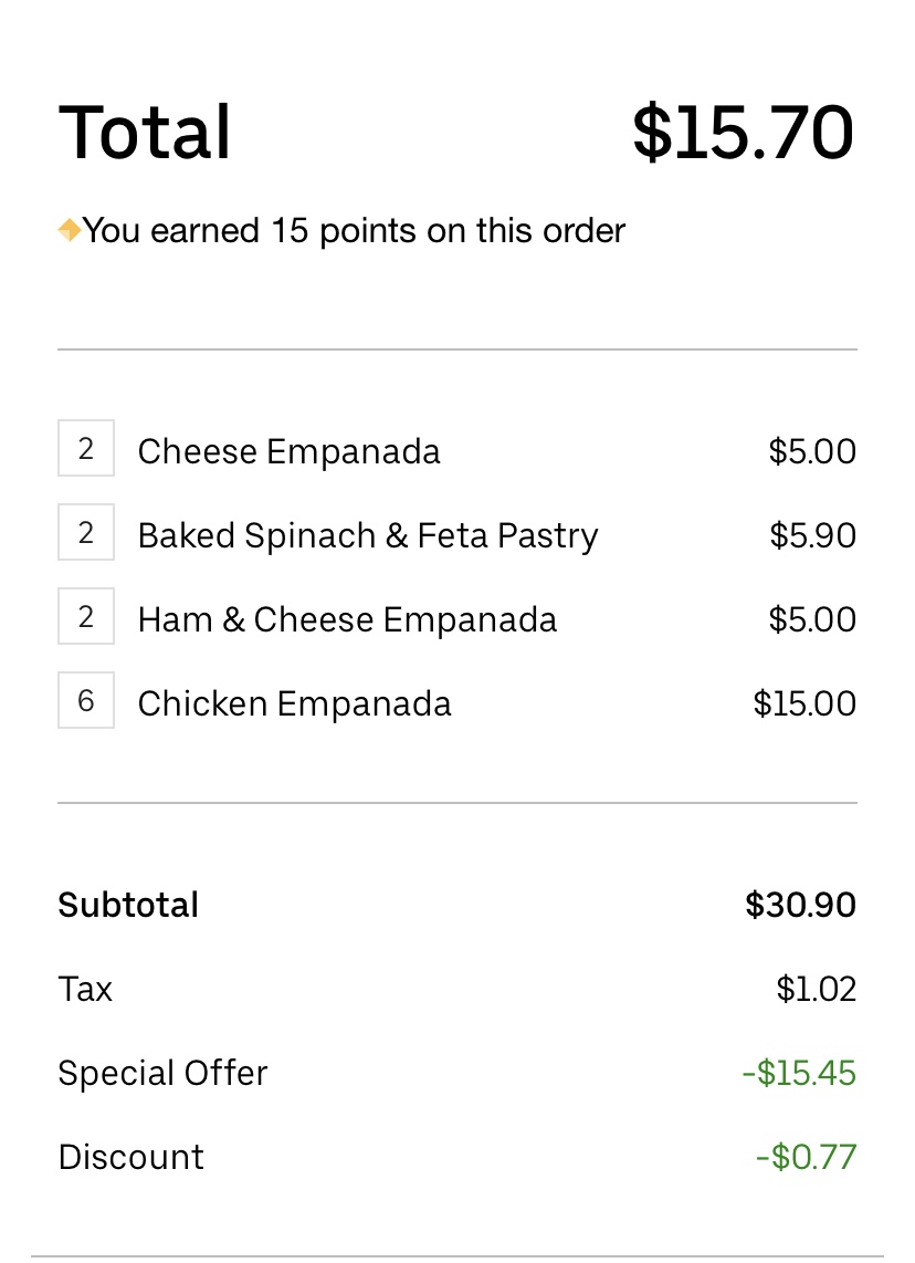 Read moreIâve attached two photos, showing my order from a week ago (using the same Buy 1 get 1 promo) and my order from today. I was notified my order was ready and 5 minutes later, a $5 adjustment was added to my order. It said it was adjusted due to âadd onsâ but the only âadd onâ i requested was the âfreeâ sauce that comes with the empanadas. I called the store and asked why and they said âthe price was wrong in uber it shouldnât be $15.â I explained itâs a promotion for buy 1 get 1 and that youâre not supposed to adjust for uber promotions. Then they kept repeatedly telling me they donât speak English even though they understood my first question. After talking to 2 different people who supposedly couldnât understand me, the lady told me to just contact uber. Thereâs no way this could have been a mistake, not only because theyâve been on uber eats and understand how the promotions work, but I literally just ordered a week ago using the same buy 1 get 1 promo and I had no issues a week ago. And with the slight possibility that it was a mistake, you donât just charge your customers for things youâre not sure of. Donât get me wrong, the food here tastes great, but I feel like they tried to pull a fast one on me as if I wouldnât realize and then made me resolve the issue myself by telling me to contact uber. Been getting empanadas from here for years and I wonât order from here again if theyâre gonna be adding $5 whenever they feel like it for no reason. Bring a friend who speaks Spanish if youâre gonna...