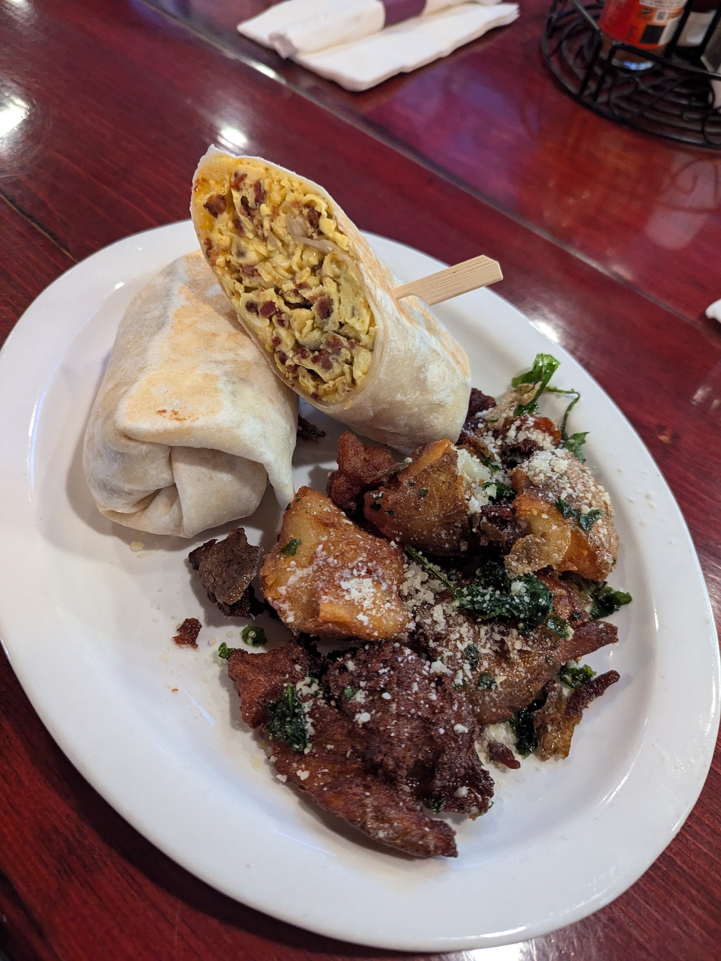 Was brought the wrong food from what I ordered. Fixed it pretty quickly, but my husband was then done a lot sooner than I was. The Monte Cristo was different. Okay. Didnt have any powdered sugar on it and wasnt served with any jam or sweet sauce as is typical for a Monte Cristo. Roasted potatoes were good.