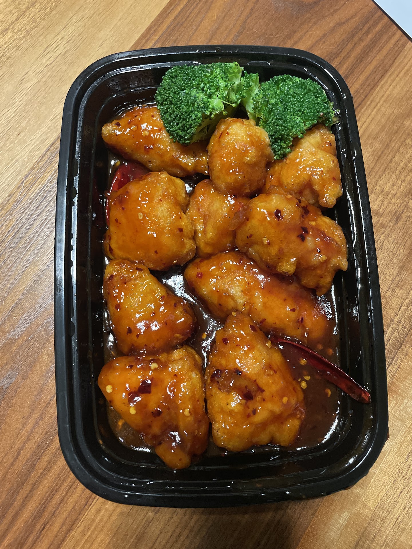 general Tso's- where I was most disappointed. The flavor actually didn't remind me of Chinese at all. they were huge pieces of fried chicken, so huge you didn't even know if it was cooked all the way though before you took a bite out of it so I was skeptical about taking more bites without double checking. I finished one peice that's all I could take. the flavor reminded me of a backyard BBQ sauce with a buffalo sauce look to it. it didn't even taste like general Tso's, if I had to close my eyes and guess what type of food I am eating, I would think American BBQ. I was looking for the awesome Chinese flavor, which this dish was missing.