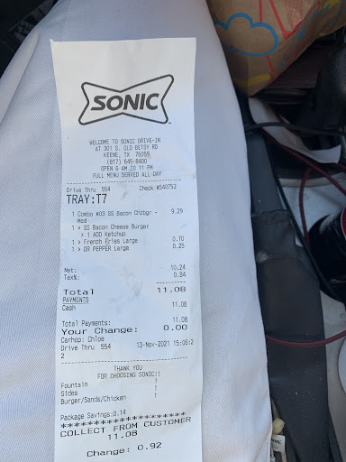 Read moreI really should know better than to go to Sonic in Keene, but I had a lapse in judgement, so I pulled in to the drive through at 6:20 on a Wednesday evening to order a couple of burgers. We had some requests on the burgers; Texas Toast on one instead of a burger bun, I asked for everything on one, along with grilled onions and pickles. The other was a regular bun, with grilled onions and pickles, and no lettuce, no mustard, and no ketchup. I should have known the order would have been jacked up the moment the lady couldn't understand what we were ordering.