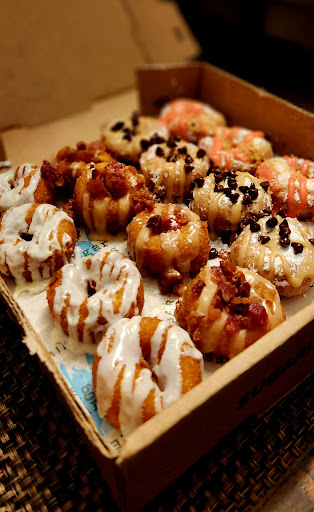 This place is known for their mini donuts. They do have coffee & iced cream options (which I did not try). I am rating and reviewing the donuts. They have a cool little deep fryer machine that fries the donuts. You can watch them as they cook. It does take a little time to prepare. I waited about 5-10 minutes for an order of 16 mini donuts. However, the store wasn’t busy when I went so it could take longer. You can order ahead online or call which I would suggest if you plan on ordering a larger batch and then make your way over. I personally don’t mind waiting because I prefer to get the donuts fresh once the order is done. I also recommend eating them at the store once you get them because they’re nice a hot, crispy. Doesn’t have the same texture and taste once they’ve cooled off. The donuts are about 1-2 inches in diameter so that gives you an idea of their size. You can pick a flavor per 6 donuts. They have a lot of variety of flavors. The base of the donut is the same, the flavors are powdery sugar, cereal type toppings, chocolate chips, or syrups they use to drizzle on the donuts which give them their distinct flavors. It’s like a carnival type of snack. Very delicious. Can’t go wrong with any of the flavors. I recommend cinnamon sugar & fruity pebbles & Oreo cookie. The other flavors I tried were blueberry + peanut butter + chocolate chip, and PB + banana + chocolate chip which were great, however be aware, on those flavored donuts, they put powdered sugar. I personally don’t like powdered sugar on donuts. Not sure if you can suggest not including it, but I would recommend that as it overwhelms the donuts flavor and the biggest thing is it takes away from the donuts crispyness. Highly recommend not having powdered sugar on these. You’ll thank me later. These would go phenomenal together with coffee/milk. Also - I kindly asked and the worker allowed me to have about 5 different flavors for 16 donuts so I could try more types. I’d say 12-16 donuts are decent for a person so you won’t feel sick but I could have easily engulfed 30 of these bad boys. The body created much saliva from the first bite of deliciousness. You’re welcome for this review. Send me a box of deliciousness if you feel this review was of any help. Also - if you’re wondering, one donut got captured into the belly before it could make the photo. Its purpose in life...