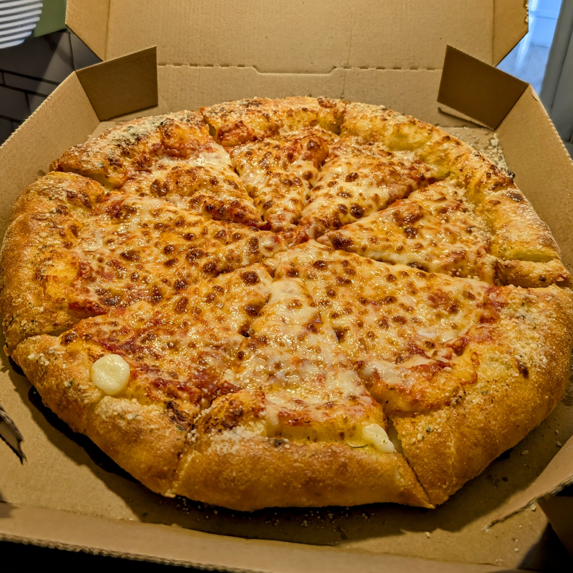 OLD REVIEW Good, consistent, relatively cheap, yet somehow quality pizza. Sadly, I spend more money here than I should. The food is always hot, and usually delivered very fast. The drivers are always friendly, and when you go to the location, they offer several ways to pick up the pizza, which is very convenient. And unlike most locations, this one even has limited dine in available (two tables).