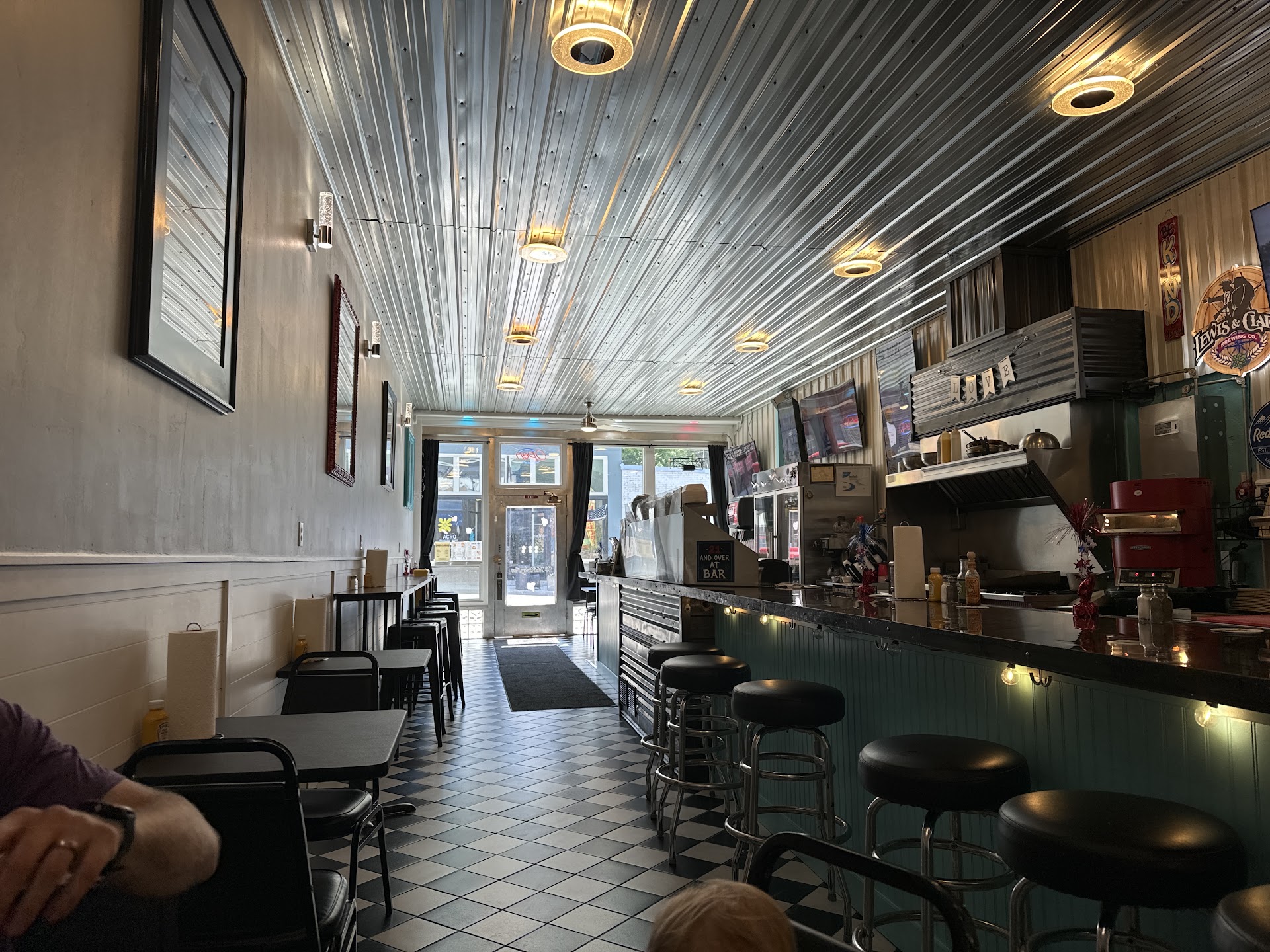 We stopped in after a day of bike riding. Not a lot of people when we arrived (but I never judge based on this). More people came and went while we were there. The owners were awesome. The recognized from our appearance that we had just finished riding the nearby Hiawatha trail and asked how it was. The restroom was by far the cleanest and brightest I have ever seen in a restaurant. The rest of the place was very clean as well. The owners stopped by a few times to talk to us. They did full remodel and did a good job of that. They even accommodated us to throw on a particular college football game we were trying to catch. Our food and drinks came out quickly. Our food was pretty tasty. I had the Sasquatch burger (Cheeseburger with bacon AND ham). My wife had the pepperoni flatbread pizza. Our friends had a Hawaiian flat bread pizza, chili dog and a few other burgers. All good. The interaction with the owners and the good food will bring us back next time in Kellogg. They even gave us a breakfast suggestion for the next morning. This was cool to me to have them help other...