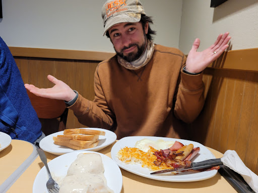 My partner ate his 3 pancakes and maybe 1/3 of the steak, and said it was cold in the center and the gravy was like jello.