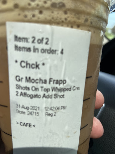 Ā Ā Ā Read moreAfter ordering bistro had to show my label to other employees and most rolled their eyes ! That being said I did ask for a GR Mocha Frapp in a Vente cup. ( didnāt happen) when asking what was so funny about my order ; her reply ā¦.. you ordered 2 Affogato Shots over the wipe cream and someone took the time to type it in at cash register and thatās what affogato means ! Now see photos below and you will see the Bistro did not pour anything over the wipe cream ⦠instead she opened a little hole in the wipe and then dumped in my shots ā¦.. drink was not what I wanted or how I ordered it ! Starbucks is getting old and I have stopped my frequency of visits and will continue to do so with this kind of service when paying premium dollars...