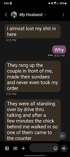 Read moreNOT fast food. I know they were busy and I don't know if the staff weren't doing their jobs or this place is understaffed. We got half of our order and was asked to pull to the side because they were waiting on fries. We waited over 10 minutes for someone to bring us the rest of our paid order. I finally had to go in to no staff member at the counter. A few minutes later, there was a customer at the counter complaining to a staff member that they prioritize the drive thru customers and she had been waiting over 20 minutes for 3 things, all ice cream. I literally had to scream at someone to get their attention, explained we had been waiting, food was just sitting there, probably for the entire time. Employee did not say anything to me just handed me the bag. Train your staff or shut your doors if you can't find people to work there. It's fast food not rocket science. Oh and with all the cars going through the drive thru, we were the only car asked to pull over and wait for a cheeseburger and fries and everything thing was...