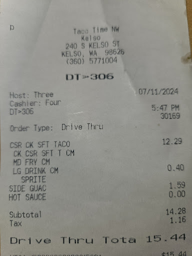 Read moreWorst EVERY!!! My daughter ordered a....I quote exactly....."a beef soft taco, no tomato." They gave her a natural soft taco. So we go and tell them, we ordered a regular soft taco, no tomato. She doesn't like the beans. Then they bring her ANOTHER natural soft taco, minus the beans. I get back in like and say I will happily pay for a regular soft taco....beef, no tomato. She was a royal witch and said she will just make her another one. Her attitude was rude beyond belief. So, when we leave, I go and thank her for making it right and she LITERALLY jerks her nose into the air, turns around and stomps off into the back. Never, ever, ever have I been treated in that manor. We owned a business with 85 employees. NEVER would I have allowed our employees to act that way. I would fired them on the spot had they acted in that manner. I will be calling the manager Monday morning! Never under any circumstances go to that Taco Time. What a shame. I have always been excited...