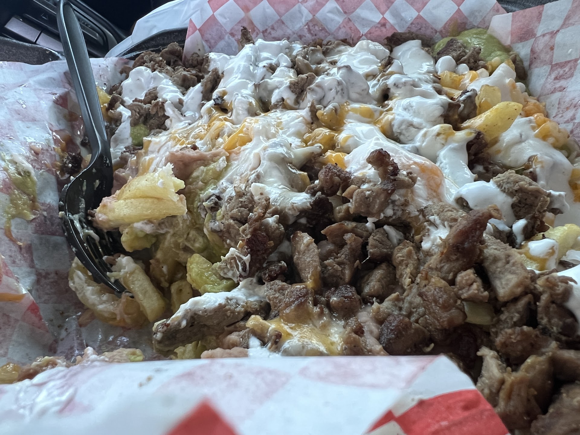 I went in meaning to try the smothered fries but was taken aback by the choices. I went with fish tacos, chile rellenos and some guacamole. The fish tacos were big, juicy and the sauce was great. Rice and beans are really good too. Chile rellenos were decent. I'd bet they'd be better in tortillas. But boy-howdy the stuff they called guacamole was so bad I threw away the pint after two bites. It was like the baby poop looking stuff at Kroger that tastes like preservatives with no chunks of avocado in it at all. Kind of surprising seeing they have so much on offer. I really hope they fix that so they can thrive. Seating for 8 inside, 24 outside covered. I will be back to try the fries or nachos, birria torta and breakfast tacos. Tuesdays is $1.75 tacos all day. If the sauce is...