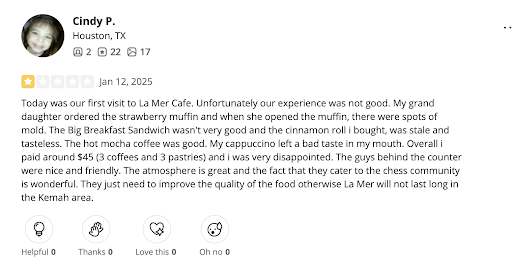 Based on recent customer reviews, there appear to be consistent concerns with food quality, coffee preparation, and service at La Mer Café. While the café has a nice atmosphere and a strong community focus, many diners have expressed disappointment with their overall experience. Freshness is one of the biggest issues mentioned. Some reviewers reported receiving pastries that they felt were stale or not properly stored, including muffins and cinnamon rolls that did not meet expectations. Others noted that certain meals arrived cold, which suggested to them that the food may not have been freshly prepared. At around $45 for three coffees and three pastries, customers expected much higher quality. Coffee quality has also drawn repeated criticism. Several patrons described their cappuccinos and lattes as tasting bitter or burnt, though one reviewer did enjoy the hot mocha. In terms of service, customers have observed long waits even when the café was not busy, as well as staff who seemed distracted during orders. Although reviewers often mentioned that employees were friendly, the experience was still overshadowed by slow service and a point-of-sale tipping system that felt aggressive, with suggested tips of up to 40% on counter-service coffee. Taken together, these patterns suggest La Mer Café risks disappointing and alienating customers if changes are not made. People want to support local businesses, but they are less likely to return if they consistently encounter concerns around food freshness, coffee quality, and service efficiency. Many reviewers concluded that unless these fundamentals improve, the café may struggle to remain competitive in...