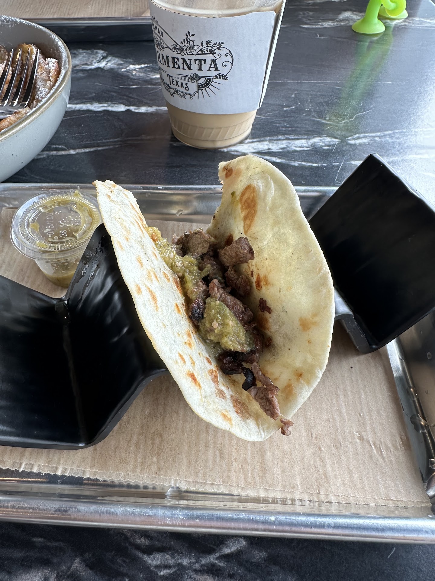 We ordered one carne asada taco, a breakfast burrito, the croissant French toast, a vanilla lavender latte, and a topochico for a total of $41.
