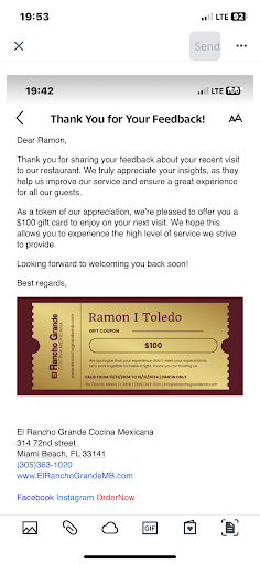 In short: I'll never go back to El Rancho Grande for lunch or dinner, neither will I recommend anyone to go there . The service and the food aren't that good. Besides, I’m curious to know why the entire staff and the owners of El Rancho Grande, a Mexican restaurant are Colombians. There could be many reasons of course. I like Colombians very much as well as their delicious dishes in fine restaurants all over Miami which I often visit. ”The cobbler should stick to his last!” (¡Zapatero...
