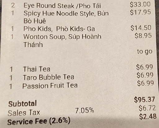Total Price was $46.01, for 2 bowls, 1 order of Fried Shrimp, and a coke. They charge a 2.60% FORCED AUTOMATIC...