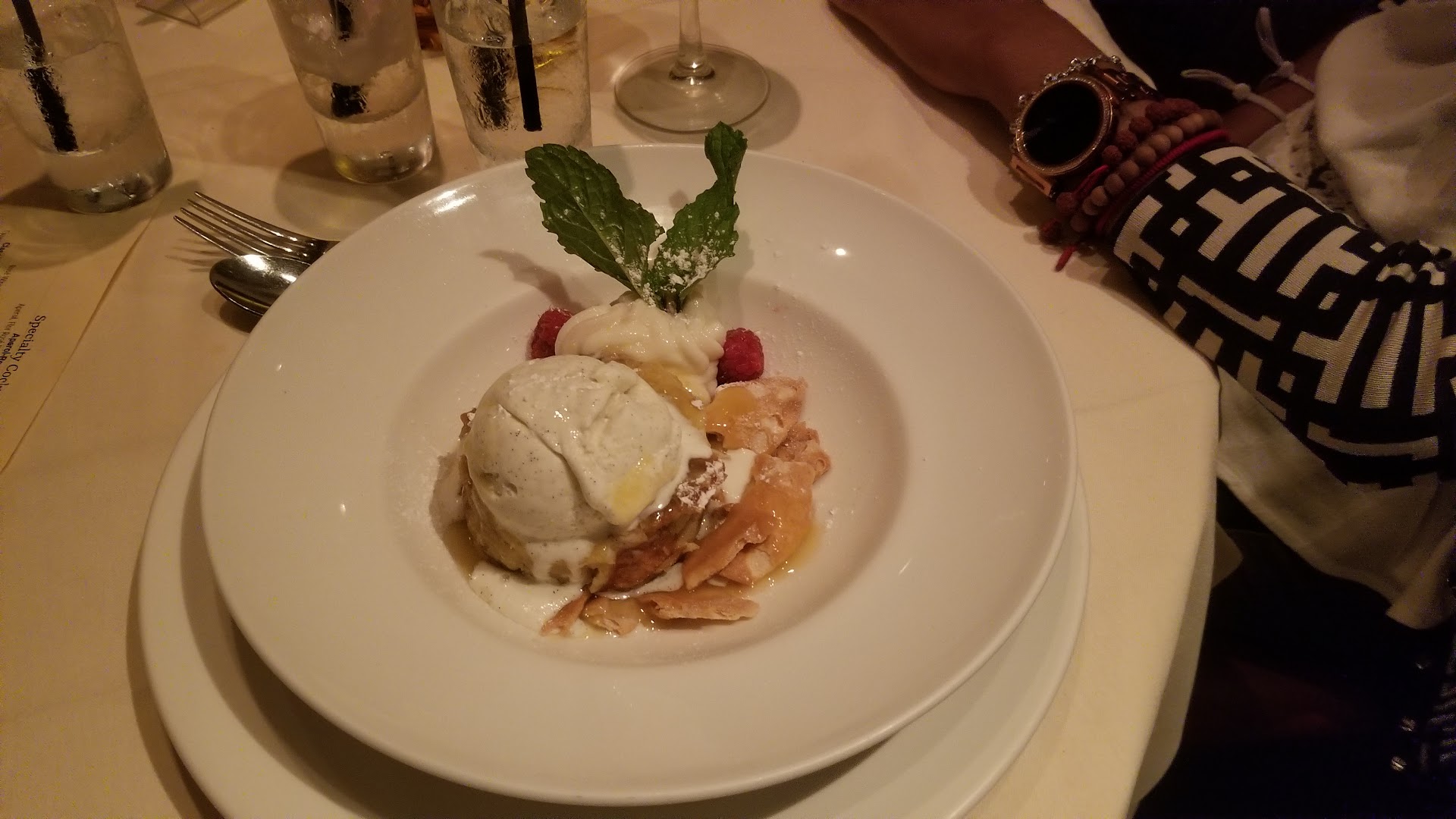We made reservations for when the restaurant opens, 5 pm. We were the first to be seated followed by 2-3 parties disbursed. Everyone was being offered water and given the drink menu, but we were just sitting there wondering when we will be greeted. Granted we are young looking so we are used to being overlooked. We had to ask a nearby waiter for water and a drink menu. He took our order and said I am not sure who is supposed to be your waiter but I'll help you, which was appreciated. We ordered our drinks, and I wanted to place appetizers before main course because I didn't want the food to just keep coming before I could enjoy my evening. It was our anniversary. We had to place the order all in at once. So of course the apps came out, dinner came out 10 minutes after finishing apps. I wanted to pair wine with my dinner, but it all just happened so fast, and I didn't even get halfway through my first cocktail before dinner came. This is a nice restaurant, I should be able to order how I want and as slow as I want when I am spending 300$. We got the baked oysters with pancetta - there was a lot of spinach, barely pancetta, plain tasting, stuffed mushrooms were good. The NY strip was good. My branzino was plain. Cocktails were strong and good. Dessert was tasty. Our waiter was great, and we appreciate him taking initiative. It was a nice night, but the experience could have...