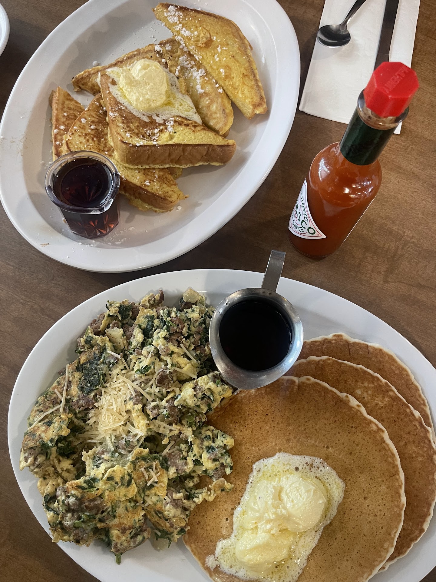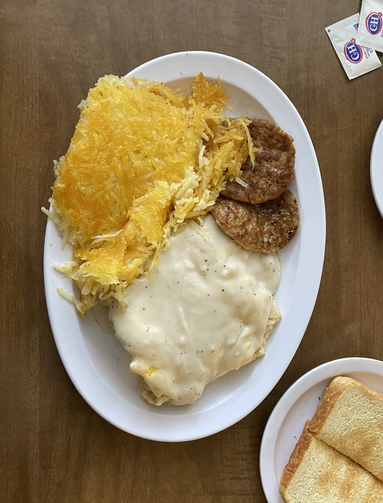 Moving on to the food - the extensive menu has all the American diner classics, with hefty portions at very reasonable prices. My wife had the veggie omelet, while I went for the veggie benedict. My benedict was tasty, slathered in hollandaise sauce which was well-made, but next time I'd ask for it on the side. Hash browns on the side were good. Veggie omelet was also good, though the veggies were mostly likely frozen. Omelet came with 6 (!) slices of French toast, which was quite good. Coffee was a little watery/bland. Overall though, we were both satisfied.